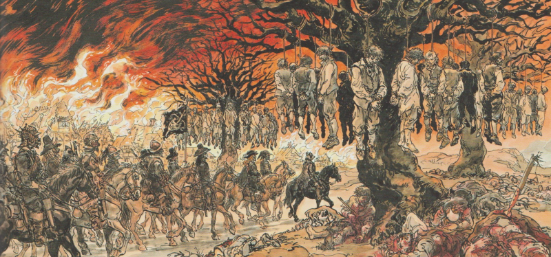 „Wówczas przyszła kolej na chichoczącą, dosiadającą trupiego wierzchowca śmierć. W końcu zjawili się następni królowie, biskupi, jeźdźcy, giermkowie i błaźni, niosąc wojnę pełną krwi róż i dźwięku werbli. Królowe zaczęły płonąć żywcem w swych wieżach. Oto śmierć, śmiejąca się władczyni, prowadząca – przy dźwięku dud – całą tę koszmarną bandę prosto do piekła. Oto wodzirejka tańca wisielców”.