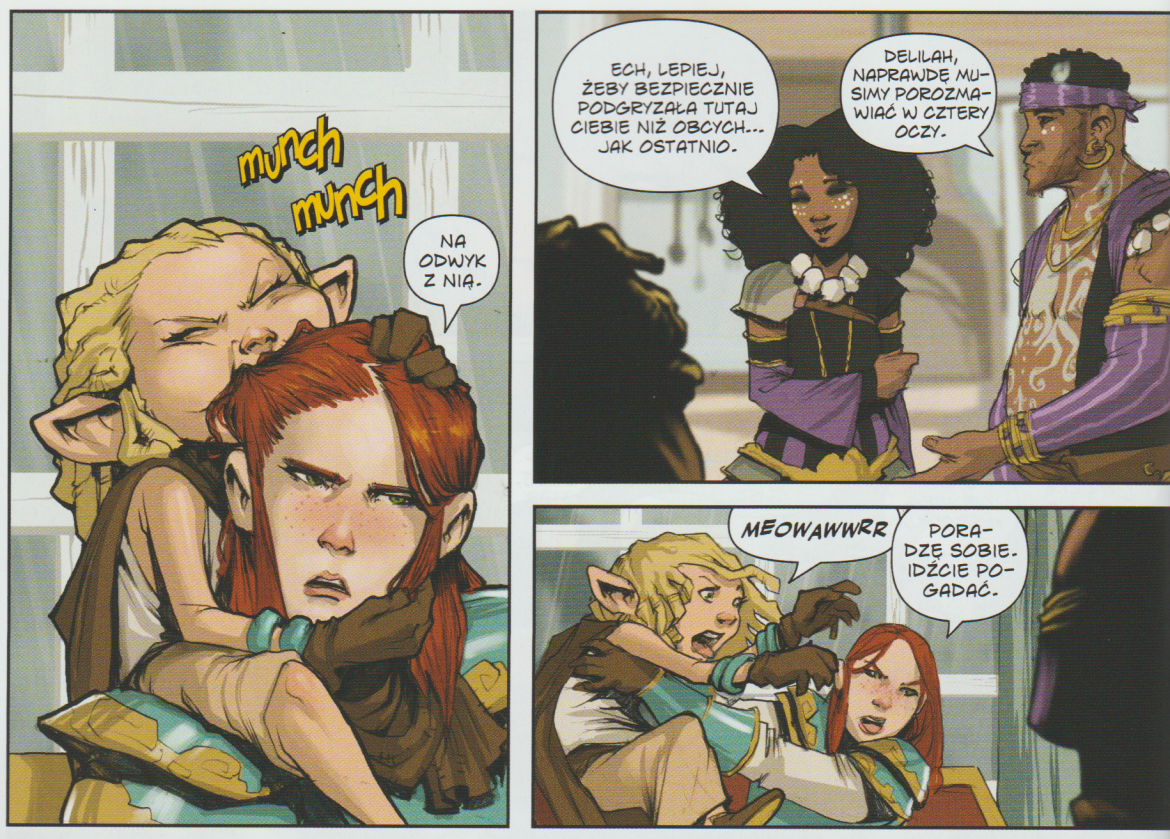 Drugi tom serii „Rat Queens”, noszący tytuł „Dalekosiężne macki N’Rygotha” to komiks zdecydowanie dojrzalszy od poprzedniego zeszytu. Za scenariusz niezmiennie odpowiada Kurtis J. Wiebe, dzięki czemu otrzymujemy szalenie interesującą historię. Po wprowadzeniu nas w nowy świat i życie jego mieszkańców, po przedstawieniu nam charakterów i osobowości głównych bohaterek, a także kilku postaci drugoplanowych, teraz Wiebe mógł przejść do rozwoju swoich pomysłów. Zrobił to płynnie i z gracją, niewyczuwalnie przechodząc z rozdziału do rozdziału, potem nieco przyspieszając, aż doszedł do momentu, gdy grunt się skończył i bohaterki zaczęły lecieć w przepaść. Czy też raczej w otchłań, bo to, czego jesteśmy świadkami w drugim tomie, jest właśnie wielowymiarową otchłanią.