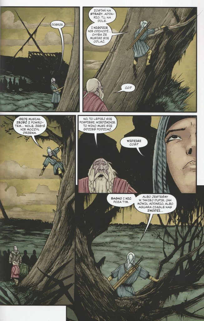 Szybka podróż przez komiks to również zasługa Joe Querio, znanego już z poprzedniej części rysownika. Ponownie dostajemy barwny świat w stłumionym, szarawym, nadającym klimatu odcieniu, tworzącym rzekę, jej brzegi i leśne ostępy. I otrzymujemy znacznie większą plejadę postaci: ogorzałe gęby najemników, zmęczonego życiem kapitana, poczciwą twarz właściciela statku, piękną, ciemnowłosą elfkę oraz aguarę, przedstawioną z lisią głową i kobiecym, niewątpliwie atrakcyjnym ciałem. Oprócz tego Querio nauczył już nas, że lubi i potrafi rysować potwory. Tym razem spotkać możemy niemałą grupę ryboludzi, upiory oraz, dla miłej odmiany, wodne wiedźmy.