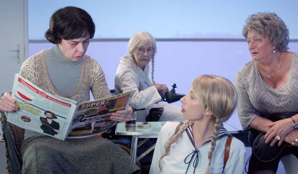 Kobiety w tym domu nie rozmawiają ze sobą, są to raczej monologi każdej z nich. Brak między nimi komunikacji, jakiegokolwiek porozumienia. Każda zatopiona jest we własnych marzeniach i problemach, nie starając się nawet zrozumieć innych. Przebywają w jednopokojowym mieszkaniu, każdy dzień spędzając tak samo – oglądając telewizję, czytając zeszłoroczne gazety, nie-rozwiązując rozwiązane krzyżówki, chwaląc się nie-odbytymi podróżami do nie-odwiedzonych miejsc i dzieląc się przepisami kulinarnymi na potrawy z resztek, bo „przecież nie wyrzucę”. Każda z bohaterek tak naprawdę marzy o lepszym życiu, czy to tym przedwojennym czy też poznanym w telewizji lub internecie, lecz nie robią nic, by do tego lepszego życia doprowadzić. Łatwiej jest wymarzone życie oglądać jedynie na ekranie telewizora, samemu pozostając jedynie „grubą świnią”. Bezrefleksyjnie podziwiają pięknych aktorów i modnie ubrane prezenterki, których doskonałość jest równie pozorna i sztuczna jak więzi w ich rodzinie. Oglądając z bohaterkami program telewizyjny poznajemy sławnego aktora (Rafał Maćkowiak), który w rzeczywistości jest alkoholikiem, nierozgarniętą prezenterkę (Agnieszka Podsiadlik), reżysera, który sławę i uznanie zdobył za film, którego nie nakręcił (Adam Woronowicz), ikonę mody, żyjącą bardziej na billboardzie lub w nowym oknie Photo Shopa (Katarzyna Warnke) czy aktorkę, która z żalu nad biednymi dziećmi zjada przeznaczone dla nich cukierki (Roma Gąsiorowska).